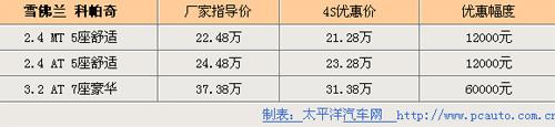 筆者日前走訪(fǎng)北京上海通用雪佛蘭4S店時(shí)獲悉,目前科帕奇最高優(yōu)惠達(dá)到6萬(wàn)元,科帕奇的性能體現(xiàn)了美國(guó)SUV的風(fēng)格,大部分時(shí)間是在公路上飛馳,能夠擁有一般轎車(chē)無(wú)法比擬的高度和視野。偶爾想要撒一下歡或者應(yīng)付一下壞路也不會(huì)讓你失望。詳情請(qǐng)見(jiàn)下表: