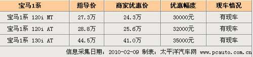 近日筆者從北京亞運村交易市場獲悉,目前購買寶馬1系轎車最高可享受3.5萬元的現(xiàn)金優(yōu)惠,具體價格見下表: