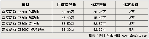 據(jù)4S店銷售人員介紹,目前雷克薩斯IS300供應(yīng)的車型均為2010款,新款車型比老款增加了諸多配置,性價(jià)比更高。同時(shí)現(xiàn)車方面,入門級和炫動(dòng)版車型的現(xiàn)金優(yōu)惠為3萬元,豪華版暫時(shí)沒有現(xiàn)車,需要預(yù)訂。硬頂敞篷跑車IS300C的優(yōu)惠幅度則達(dá)到了5萬元。