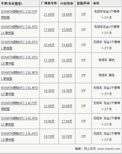作為SONATA御翔的換代車(chē)型-----北京現(xiàn)代索納塔領(lǐng)翔于08年底正式上市銷(xiāo)售,是結(jié)合了韓國(guó)現(xiàn)代最先進(jìn)的造車(chē)技術(shù),憑借著大氣穩(wěn)重外形,寬大空間,乘坐性高,強(qiáng)勁動(dòng)力等較高的綜合性價(jià)比屹立于中級(jí)車(chē)之林。根據(jù)網(wǎng)上車(chē)市價(jià)格監(jiān)測(cè)系統(tǒng)顯示,目前領(lǐng)翔全系現(xiàn)金優(yōu)惠2萬(wàn)元,現(xiàn)車(chē)不全,具體車(chē)型需預(yù)定,具體行情如下: