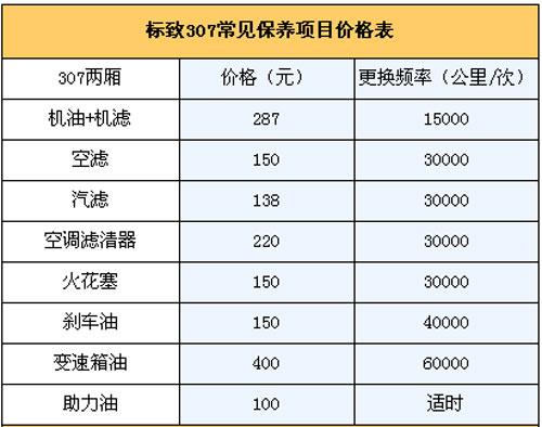 5.保養(yǎng)費(fèi): 我們向標(biāo)致4S店售后服務(wù)人員咨詢過,他們說307一大優(yōu)勢(shì)是保養(yǎng)周期比較長(zhǎng),1.5萬(wàn)公里才需要保養(yǎng)一次,是同級(jí)車型中保養(yǎng)花費(fèi)最低的。通常新車首保在7500公里時(shí)進(jìn)行,以后每1.5公里保養(yǎng)一次。第二次1.5萬(wàn)公里時(shí)的常規(guī)保養(yǎng)(更換機(jī)油機(jī)濾)需花費(fèi)287元;3萬(wàn)公里保養(yǎng)(更換機(jī)油機(jī)濾+空濾+空調(diào)濾芯+汽濾+火花塞)為795元;4.5萬(wàn)公里保養(yǎng)(更換機(jī)油機(jī)濾)花費(fèi)287元;6萬(wàn)公里保養(yǎng)(更換機(jī)油機(jī)濾+空濾+空調(diào)濾芯+汽濾+火花塞)為795元。