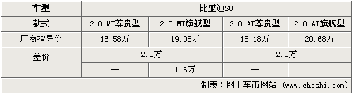 比亞迪S8是國內(nèi)首款具有硬頂敞篷技術(shù)的轎跑車,是比亞迪又一款高端化戰(zhàn)略產(chǎn)品。S8凝聚了比亞迪多年成功的轎車研發(fā)經(jīng)驗,融合了國際汽車制造領(lǐng)域最尖端的汽車科技,全面展現(xiàn)了比亞迪汽車強大的技術(shù)實力。其中手動擋或自動擋的尊貴型與旗艦型差價為2.5萬,而手動擋與自動擋車型之間的差價為1.6萬元。