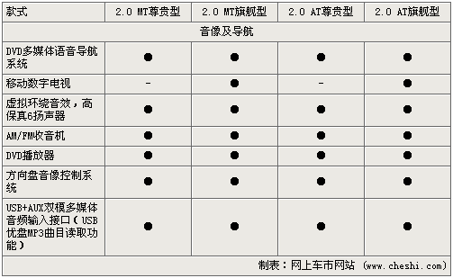 在音像及導(dǎo)航配置方面,差別同樣不大,尊貴型與旗艦型的差別只是移動數(shù)字電視,其他如DVD導(dǎo)航及音響播放器、6喇叭揚聲器等,應(yīng)該說是非常齊備的音響系統(tǒng)了。