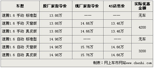 速騰作為一汽大眾新一代“A級”車生產(chǎn)平臺的產(chǎn)物,上市當(dāng)初憑借全系車型標(biāo)配ESP電子穩(wěn)定程序而成為統(tǒng)計(jì)標(biāo)桿。隨著國家對1.6及以下排量車型減免一半購置稅政策的出臺,速騰1.6車型更受到消費(fèi)者的追捧。據(jù)網(wǎng)上車市價(jià)格監(jiān)測系統(tǒng)顯示,速騰1.6排量全系車型廠家指導(dǎo)價(jià)格上調(diào),優(yōu)惠幅度降低。相關(guān)車型及價(jià)格如下表所示: