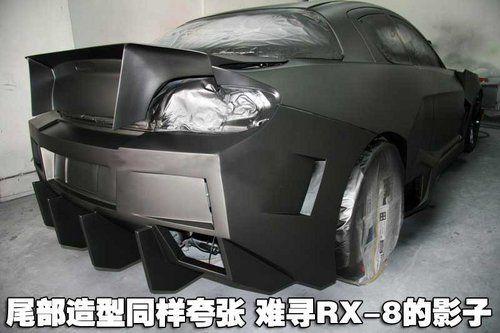 RX-8改裝版的尾部造型雖然與蘭博基尼蓋拉多不太相像,但夸張的造型令人印象深刻,上翹的后尾翼、碩大的后底部導(dǎo)流槽,方方正正的造型絕對很奪人眼球。