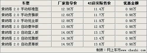 索納塔作為北京現(xiàn)代銷售的第一款車型,在中國地區(qū)銷售了已經(jīng)快7年了。隨著新車型的增加,索納塔已經(jīng)漸漸的失去了市場競爭力了。在4月的上海國際車展上,北京現(xiàn)代展出了自主研發(fā)車型新索納塔BT01,一經(jīng)亮相就立刻受到了中國消費者的關注。近日我們從北京現(xiàn)代內(nèi)部人士處獲悉到,主研發(fā)車型新索納塔BT01將于7月份正式推出。與此同時,根據(jù)網(wǎng)上車市價格監(jiān)測系統(tǒng)顯示,目前銷售的索納塔全系均出現(xiàn)了大幅優(yōu)惠,2.0標準版車型的售價僅為11.4萬。具體車型售價見下表: