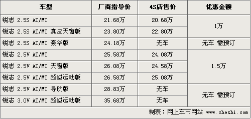 銳志的原車型是在日本廣受好評(píng)的“MARK-X”系列,國(guó)產(chǎn)后的銳志同MARK X一樣配備有2.5L和3.0L兩種排量的發(fā)動(dòng)機(jī),但取消了四驅(qū)車型,全部為前置后驅(qū),同時(shí)超長(zhǎng)的軸距設(shè)計(jì)讓乘員的空間也有了非常理想的狀態(tài)。同時(shí)也是頗受改裝車迷喜愛的一款車型,目前銳志在車款的價(jià)格上有一定幅度的優(yōu)惠,最高可優(yōu)惠1.5萬(wàn)元,具體車型和價(jià)格如下:
