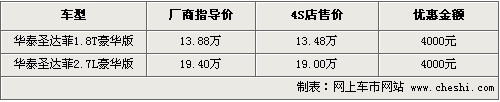 據(jù)4S店銷售人員介紹,目前圣達菲在北京地區(qū)銷售的主要是汽油版1.8T和2.7高配車型。其中2.7排量高配車型售價為19.4萬,1.8T國四排放標(biāo)準(zhǔn)的豪華版售價為13.88萬元。目前購車可以優(yōu)惠現(xiàn)金4000元,如果到店的話還能有一定幅度的讓利,F(xiàn)車方面,主要有銀色、黑色、白色以及灰色等供應(yīng),可供挑選的余地很大。另據(jù)介紹,柴油版車型在北京均無法上牌,而這兩款不存在此問題。