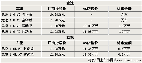 青年蓮花競(jìng)速?gòu)纳鲜泻笠呀?jīng)有兩次官方降價(jià),總降幅達(dá)兩萬(wàn)元。據(jù)青年蓮花4S店銷售人員介紹,競(jìng)速目前只有運(yùn)動(dòng)版兩款車型銷售,這兩款車型都可以優(yōu)惠1.9萬(wàn)元,最低售價(jià)僅為10.08萬(wàn)元。而剛上市時(shí)間不就的競(jìng)悅目前也有6000元的優(yōu)惠幅度,而4S店銷售人員表示,如果到店還可以有更多的優(yōu)惠政策。