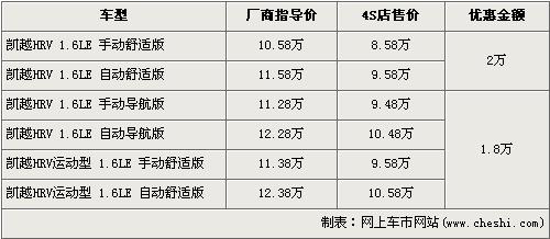 據(jù)經(jīng)銷商處銷售人員介紹,凱越HRV共有6個車型在售,近期除了舒適版現(xiàn)金優(yōu)惠仍然是2萬元外,其他4款車型的均優(yōu)惠1.8萬元。入門車型的凱越HRV 1.6LE 手動舒適版現(xiàn)金優(yōu)惠售價仍為8.58萬元。而導航版與運動版車型優(yōu)惠1.8萬元,但是此兩版車型店內(nèi)均無現(xiàn)車,欲購買的消費者需交訂金1萬元,最早兩周內(nèi)可以提車。
