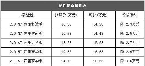 我們近日從北京地區(qū)的一家經(jīng)銷(xiāo)商處了解到,在穩(wěn)定了一個(gè)季度之后,途勝的優(yōu)惠再次增加,目前09款途勝全系車(chē)型的優(yōu)惠增加到2.3-3.6萬(wàn)元區(qū)間,平均價(jià)格比一個(gè)月前下降了3000元左右,性價(jià)比再次得到提升。以下是09款途勝在北京地區(qū)綜合經(jīng)銷(xiāo)商處的最新報(bào)價(jià)表:
