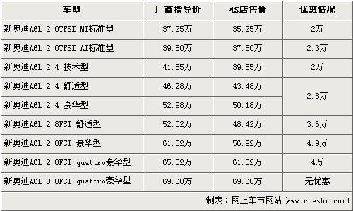 據(jù)4S店銷售人員介紹,目前奧迪A6L全系可以最高優(yōu)惠4.9萬元。奧迪A6L全系分為2.0TFIS,2.4L,2.8FSI,3.0FSI四種共10個車型,最低配的2.0TFSI標(biāo)準(zhǔn)型經(jīng)2萬元優(yōu)惠后售價從37.25萬元下降到了35.25萬元,而2.8FSI 豪華版經(jīng)全系最高的4.9萬元優(yōu)惠后售價也降到了56.92萬元。全系最高配的3.0FSI quattro豪華版目前店內(nèi)沒有現(xiàn)車,欲購買的消費者需要交1萬元訂金,約等3個月后方可提車。