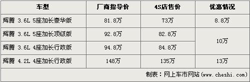 據(jù)北京進(jìn)口大眾經(jīng)銷店銷售人員介紹,目前輝騰3.6L 5座加長豪華版有8.8萬元的現(xiàn)金優(yōu)惠,經(jīng)優(yōu)惠后3.6L 5座加長豪華版的售價降到了73萬元,跌破了75萬元。排量稍大的4.2L 4座加長行政版有13萬元的優(yōu)惠,經(jīng)優(yōu)惠后售價從148萬元下降到了135萬元。銷售人員還介紹,4.2L輝騰沒有現(xiàn)車,欲購買的消費者需交訂金10萬元預(yù)訂。