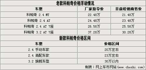 與此同時,2010年開始進口雪佛蘭科帕奇在北京市場的售價都以穩(wěn)定的優(yōu)惠幅度進行銷售。例如2.4升車型普遍優(yōu)惠一萬元,實際售價僅為21.48-25.58萬;3.2升旗艦車型為30.28萬優(yōu)惠幅度達到7萬元。那么現(xiàn)款科帕奇在優(yōu)惠后的價格區(qū)間也恰好與內(nèi)部人士透露的新款車型上市后的價位區(qū)間相近。