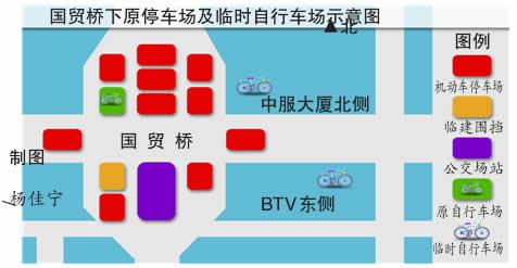 針對市民關(guān)注的自行車停放問題,CBD管委會表示,原有的自行車停車場將延時開放,同時就近開辟兩處自行車臨時停放場地。一處位于原自行車場地的東北側(cè),中服大廈北側(cè),停放自行車數(shù)量可達(dá)200輛,與原場地停放數(shù)量相當(dāng)。