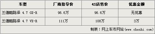 蘭德酷路澤是豐田旗下最經(jīng)典的越野車型之一,其應(yīng)用了豐田多項高科技技術(shù),不僅增強了全車的越野性能和安全性,也為駕乘者提供了最直觀的駕乘體驗。自去年9月份大排量消費稅推出后,豐田越野車的代表作蘭德酷路澤的廠商指導(dǎo)價也相應(yīng)作出了調(diào)整,4.7L的兩款車型售價分別漲到了96.6萬元和111萬元。近日據(jù)網(wǎng)上車市價格數(shù)據(jù)監(jiān)測顯示,蘭德酷路澤全系出現(xiàn)了3萬元的優(yōu)惠,具體詳情看下表: