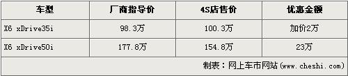 在此次上海車展上,寶馬帶來了旗下高性能系列M系的所有車型,其中x5M和x6M是首次在國內(nèi)與眾人見面,同時(shí)也是受關(guān)注度最高的兩款車型。近日根據(jù)網(wǎng)上車市價(jià)格監(jiān)測系統(tǒng)x6M的普通版車型X6價(jià)格出現(xiàn)了松動(dòng),全系最高優(yōu)惠達(dá)到了23萬元,具體車型價(jià)格行情請(qǐng)看下表: