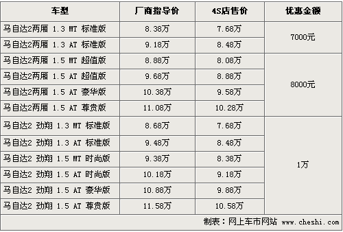 馬自達2是長安馬自達繼3系列之后又一定位更加年輕化的城市小車,Mazda2沿襲馬自達經典的“Zoom-Zoom”設計理念,并同時結合了優(yōu)異的安全性、舒適性及燃油經濟性表現(xiàn)。根據(jù)網(wǎng)上車市價格監(jiān)測系統(tǒng)顯示,目前全系最高可優(yōu)惠現(xiàn)金1萬元左右,具體行情如下: