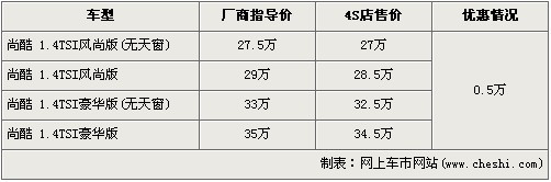 與高爾夫六代同平臺的大眾Scirocco尚酷轎跑車,自從廣州車展上正式發(fā)布后,便引起了眾多車友的關注。大眾Scirocco尚酷轎跑車采用了大眾IROC概念車的大量設計元素,激進的外觀給人留下了深刻的印象。大眾Scirocco尚酷轎跑車分為1.4T和2.0T兩種排量車型,先期上市的為1.4T車型。近日據(jù)我走訪北京多家大眾4S店得知,大眾尚酷1.4T全系出現(xiàn)5000元優(yōu)惠,具體車型價格請看下表: