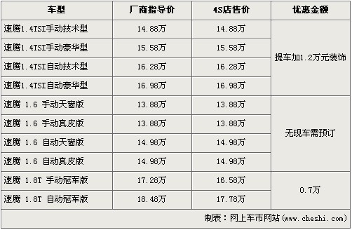 據(jù)一汽大眾4S店銷售人員介紹,店內(nèi)有速騰最新上市的1.4TSI車型現(xiàn)車,并且近期購買1.4TSI的消費(fèi)者需加裝價(jià)值1.2萬元的裝飾才可提車。1.6L車型全部沒有現(xiàn)車,欲購買者需交訂金1萬元,約等2個(gè)月才可提車。近期購買1.8T車型的消費(fèi)者可以得到7000元的現(xiàn)金優(yōu)惠。