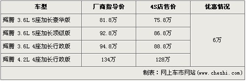 據(jù)北京進(jìn)口大眾經(jīng)銷店銷售人員介紹,目前輝騰全系有6萬元的現(xiàn)金優(yōu)惠,經(jīng)優(yōu)惠后3.6L 5座加長豪華版的售價(jià)降到了75.8萬元。排量稍大的4.2L 4座加長行政版經(jīng)優(yōu)惠后售價(jià)從134萬元下降到了128萬元。銷售人員還介紹,4.2L輝騰沒有現(xiàn)車,欲購買的消費(fèi)者需交訂金10萬元預(yù)訂。