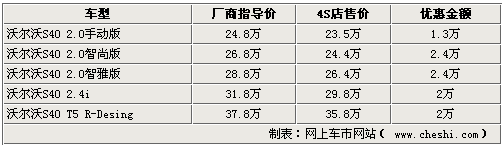 S40在沃爾沃家族中算是入門級轎車,偏運(yùn)動(dòng)的設(shè)計(jì)風(fēng)格表現(xiàn)出動(dòng)感、活潑的氣息,同時(shí)一改沃爾沃低調(diào)示人的內(nèi)斂氣質(zhì)成為很多消費(fèi)者購車的首選。網(wǎng)上車市網(wǎng)站近日了解到,北京地區(qū)的沃爾沃S40車型價(jià)格均有所變動(dòng),現(xiàn)階段購車全系均可享受最高2.4萬元的優(yōu)惠。詳情如下: