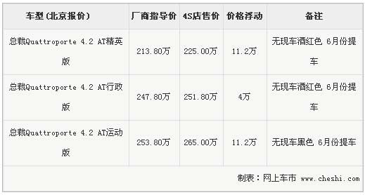 據(jù)北京地區(qū)瑪莎拉蒂展廳銷售人員介紹,全新Quattroporte總裁目前沒有現(xiàn)車銷售,但6月份會有一批現(xiàn)車抵達展廳,其中包括酒紅色的精英版,售價225萬元;還有酒紅色的行政版,售價251.8萬元;另外,全新Quattroporte總裁運動版將會有一臺黑色現(xiàn)車抵達,售價265萬元。該銷售人員表示,這批全新Quattroporte總裁將會在原有車型上增加更多配置,所以價格會有所提升。