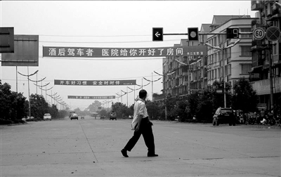 進(jìn)入夾江城區(qū),主要街道上隨處可見(jiàn)禁止酒后駕車(chē)的宣傳橫幅。其中,縣城瓷都大道與迎春南路交會(huì)處的兩條標(biāo)語(yǔ)尤為醒目,上面分別寫(xiě)著“酒后駕車(chē)者醫(yī)院給你開(kāi)好了房間”“酗酒開(kāi)車(chē)是駛向死亡與墳?zāi)沟倪x擇”等警示內(nèi)容。