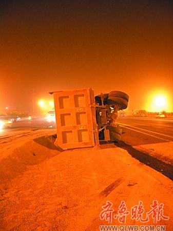 5日晚上8時許,在濟南經(jīng)十東路邢村立交橋東側(cè),一輛滿載沙子的斯太爾大貨車與一輛小轎車相撞,大貨車發(fā)生側(cè)翻,沙子撒了一地,汽油從油箱里流了出來,空氣中彌漫著汽油的味道。而小轎車車身嚴(yán)重變形,基本報廢。