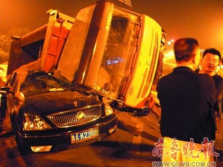 6日凌晨1時許,在濟南經(jīng)十路與千佛山路交叉口,一輛滿載沙子的斯太爾大貨車與一輛小轎車相撞,大貨車側(cè)翻將小轎車壓在了身下,沙子撒了一地,汽油從油箱里漏了出來,在路面上形成了很大一片油漬。小轎車的駕駛員位置被大貨車壓扁,車身后部則被沙子掩埋。