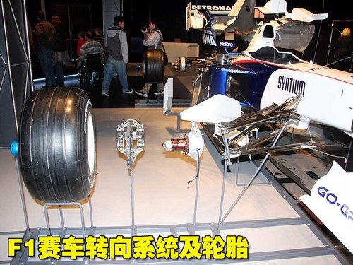 這張圖展現(xiàn)的是F1賽車轉(zhuǎn)向系、剎車系統(tǒng)及輪胎,其中我們看到F1賽車轉(zhuǎn)向拉桿為碳纖維材質(zhì),在保持強(qiáng)度的同時減輕賽車重量,而剎車系統(tǒng)是采用Brembo六活塞剎車卡鉗、碳纖維制動襯墊、制動碟。輪胎則是由普利司通獨(dú)家提供的Potenza系列賽車輪胎。