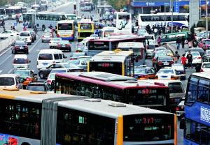 中關(guān)村海龍大廈前一路口由于混亂的交通產(chǎn)生擁堵。