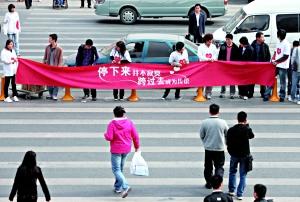 “停下來并不寂寞,跨過去成為傳說。”昨日(27日)上午,中關(guān)村海龍大廈前面的丁字路口,十余名年輕人手持橫幅,在人行道上站成三排,組成“人肉斑馬線”,陪行人一起等紅燈。活動(dòng)的發(fā)起者表示,大家通過網(wǎng)絡(luò)召集,旨在用這種類似行為藝術(shù)的方式,提示人們珍愛生命,勿闖紅燈。