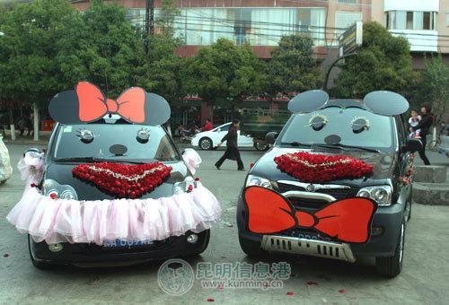 大紅色的蝴蝶結(jié)、黑色靈巧的眼睛、玫瑰花鋪成的鼻子,一輛小型越野車經(jīng)過(guò)巧妙的裝扮,變成了可愛的“米老鼠”。一旁,站著“Mickey”的愛人“ MINI[綜述 圖片 論壇]”。粉色的公主紗、車頂戴上蝴蝶結(jié)、滿天星花朵做成長(zhǎng)長(zhǎng)的睫毛、配上黑黑的大眼睛,比亞迪小車搖身一變成了“MINI”、“Mini”嬌羞地站在“Mickey”旁邊,引得路人駐足觀看!疤蓯哿耍囎舆@樣一打扮,都認(rèn)不出原貌了,比奔馳還拉風(fēng),真有創(chuàng)意!”一名男士拿出手機(jī),為兩只可愛的“米老鼠”拍照。兩輛造型可愛的婚車,引來(lái)不少路人拍照留念。
