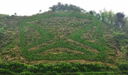 從圖上可以看出,一面數(shù)千平米的山坡上,數(shù)千棵樹(shù)木排列成奇怪而規(guī)則的圖案——一個(gè)規(guī)則的方框內(nèi)三個(gè)獨(dú)立的小三角,將空間劃分開(kāi)來(lái),看線條,極似“X”,與旁邊野生的樹(shù)木形成鮮明對(duì)比。初步判斷,“神秘林”絕非天然形成。據(jù)當(dāng)?shù)厝罕姺从,神秘?shù)陣的所在地確實(shí)是在武功山,處于安?h北側(cè)的北華山附近。樹(shù)林是幾天前出現(xiàn)的,但為什么是這個(gè)圖案,當(dāng)?shù)厝税偎疾坏闷浣!霸瓉?lái)并沒(méi)有相似的事情發(fā)生”一位李姓村民說(shuō)道,“最近大家都開(kāi)始議論這是不是所謂的麥田怪圈!”