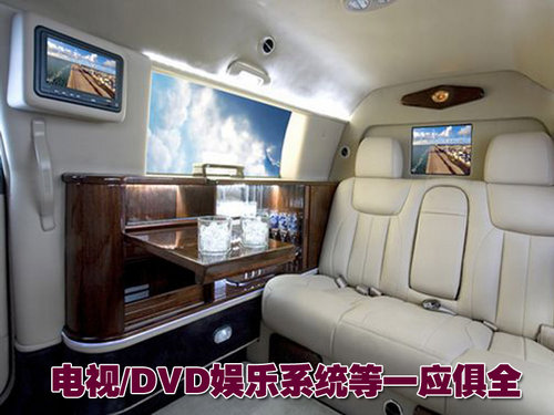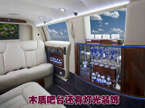 上等的真皮裝潢、電視以及DVD娛樂系統(tǒng)、小型酒吧臺均是該車的必要配置,此外其還擁有WiFi 無線網(wǎng)絡(luò)系統(tǒng)。12伏的電源插口,不銹鋼點(diǎn)綴裝飾的木質(zhì)裝飾吧臺還有燈光作為點(diǎn)綴。
