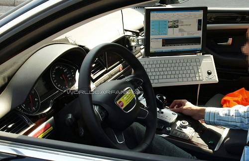 最近諜照記者設法拍到了奧迪新一代A8的內(nèi)裝照片。雖然這輛測試車的內(nèi)裝混合了現(xiàn)行版和下一代車型的內(nèi)裝配置,但仍能看出新車采用了新的方向盤,經(jīng)過升級的儀表群以及造型古怪的變速桿,它或許可以提供包括自動泊車等先進功能。測試人員右側放置的電腦顯示了新車正在測試的是車輛監(jiān)測技術,該技術利用攝像頭和傳感器來探測車輛是否處于可能與其他車輛發(fā)生碰撞的危險環(huán)境中。