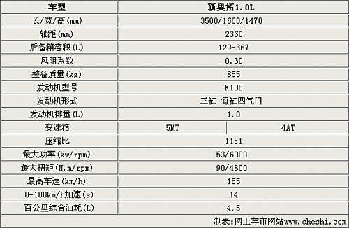今年下半年將在長安鈴木投產(chǎn)的新奧拓,長寬高分別達到3500/1600/1470毫米,軸距也達到了2360毫米,與長安奔奔等車型同一級別。作為一款微型轎車,新奧拓的風阻系數(shù)達到了0.3,再加上855kg的整備質(zhì)量,對整車的動力性能有很大幫助。