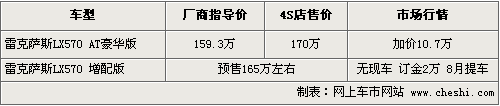 筆者目前從雷克薩斯經(jīng)銷商處了解,雷克薩斯LX570因產(chǎn)能有限,貨源供應非常緊張。目前基本是訂單式銷售,而提現(xiàn)車的話加價金額則超過了10萬元。同時,雷克薩斯LX570增配版車型將于8月份到店,銷售人員介紹,增配版車型將增加智能副駕系統(tǒng),同時在內飾和外觀上也有小幅的變化,預計售價在165萬左右。具體售價目前尚未公布,現(xiàn)在消費者訂車需要2萬元定金,一個月左右方可提車。