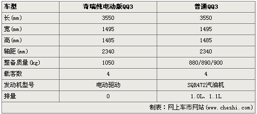 從基本參數(shù)來看,純電動(dòng)版QQ3與普通版QQ3相比,車身尺寸沒有變化,不過在車重上增加了不少,這可以看出電動(dòng)模塊還是比較重的,當(dāng)然比較特別的電動(dòng)QQ3絕對(duì)零排放,不過對(duì)于電動(dòng)模塊的參數(shù)暫時(shí)還沒有,有待進(jìn)一步的消息發(fā)布。