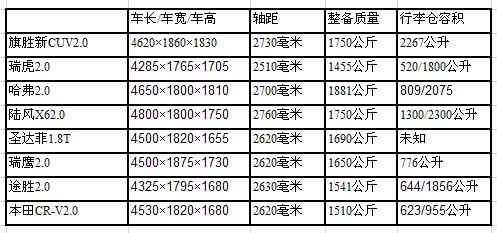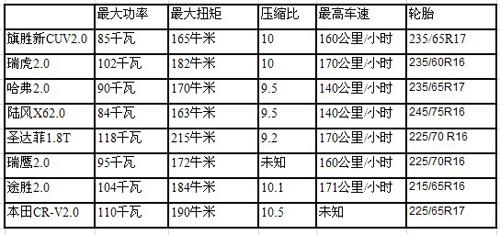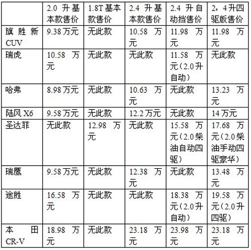 我們從廠家了解到,新旗勝已經(jīng)全面上市,動力分為2.0升和2.4升兩個系列,分為兩驅(qū)和四驅(qū)共6個車型。外形看,這是一款頗為漂亮的車子,外形、做工和配置,與其售價(jià)很是不符。為了讓大家對其有所了解,這里把新旗勝和同級的幾款自主品牌SUV以及小一個級的SUV(比如瑞虎)做一番簡單對比。為了參考的更全面,還把包括本田CR-V在內(nèi)的幾款合資車同時(shí)排列,盡管它們所面對的,并非同一個市場,特別是像本田這樣的車型,與自主品牌相比,品牌價(jià)值差異較大,不能做直接對比,只能是個參考。