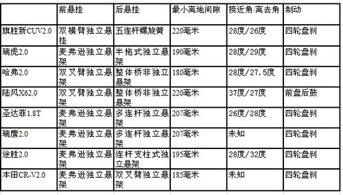 SUV車主要的任務(wù)不是去真正的越野探險(xiǎn),在提供舒適的前提下,它只需具備一定的通過能力,從這些SUV車的懸掛就能看出這一點(diǎn)。在這一點(diǎn)上,表格中的8款SUV車,除了陸風(fēng)的X6在性能上偏向越野車之外,其余各款車型,均以追求舒適為主。