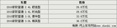 歐藍(lán)德是三菱汽車第一款采用轎車底盤形式生產(chǎn)的SUV,沿用了三菱Lancer(藍(lán)瑟)轎車的平臺(tái),具有轎車乘坐的舒適性,同時(shí)它又有SUV的特性。全新一代的歐藍(lán)德EX采用了藍(lán)瑟EVO車型典型的隔柵及雙氙氣前車燈的造型,使得其看起來(lái)更加兇猛。2009年10月13日三菱汽車正式在中國(guó)地區(qū)推出了全新一代歐藍(lán)德EX車型,售價(jià)26.8-36.2萬(wàn)元不等。近日我們從三菱汽車內(nèi)部人士處了解到,為了更好的滿足中國(guó)消費(fèi)者,三菱汽車將在廣州車展上推出2.0排量的歐藍(lán)德車型,預(yù)計(jì)售價(jià)將在22萬(wàn)元左右。與此同時(shí),我們從北京地區(qū)三菱4S店了解到,目前2.4排量的已有現(xiàn)車銷售,但車型不全,全系車型暫時(shí)沒有任何型形式的優(yōu)惠。具體車型售價(jià)見下表:
