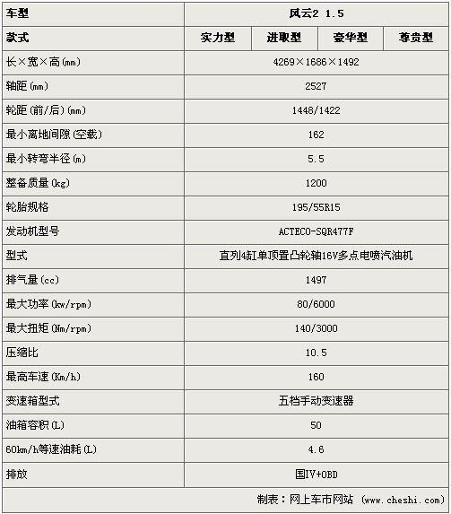 從車身尺寸來看,風(fēng)云2三廂要比新旗云小很多,但在軸距方面卻比新旗云大不少,可以預(yù)計(jì)車內(nèi)空間相當(dāng)?shù)貌诲e。在動力上,風(fēng)云2裝備的是奇瑞自主研發(fā)的SQR477F發(fā)動機(jī),最大功率80kw,最大扭矩140牛米,配合5速手動變速器,并且在排放上達(dá)到了國Ⅳ標(biāo)準(zhǔn)。