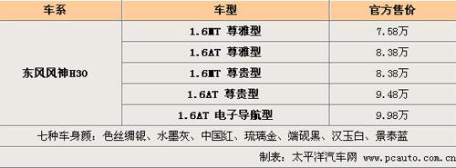 1月27日,備受期待的東風(fēng)風(fēng)神首款精品兩廂車東風(fēng)風(fēng)神H30,以“從容進(jìn)取、自由人生”為產(chǎn)品主張,在“自由之都”——成都拉開了全國自由上市帷幕。東風(fēng)汽車公司副總經(jīng)理、東風(fēng)乘用車公司總經(jīng)理李紹燭公布了東風(fēng)風(fēng)神H30五款上市車型的價格:1.6MT尊雅型7.58萬元,1.6MT尊貴型8.38萬元,1.6AT尊雅型8.38萬元,1.6AT尊貴型9.48萬元,1.6AT 電子導(dǎo)航型9.98萬元。
