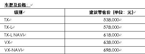 作為舊款VX級別車型的延續(xù),TX-L級別配置更加豐富,采用4.0L雙VVT-i的發(fā)動機,性能大幅提升。除沿用了舊款VX級別所配備的主動牽引力控制系統(tǒng)A-TRC以及車輛穩(wěn)定控制系統(tǒng)VSC外,還增加了第三排座椅電動折疊功能、智能鑰匙及一鍵啟動系統(tǒng)、自發(fā)光式儀表盤等,同時,SRS空氣囊也增至7個。在這種配置下,TX-L級別的價格設定為57.8萬元,比舊款VX級別的價格還低7千元。