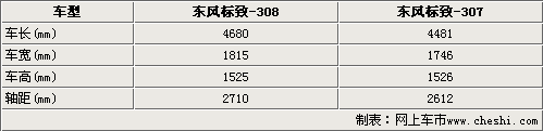 東風(fēng)標(biāo)致308車身尺寸明顯超過(guò)了標(biāo)致307車型,4680mm車長(zhǎng)、1815mm的車寬和1525mm的車寬,使得標(biāo)致308外形更加大氣,同時(shí)在加上2710mm的軸距,進(jìn)一步確保了標(biāo)致308車內(nèi)空間的寬敞,標(biāo)致307的軸距僅為2612mm。
