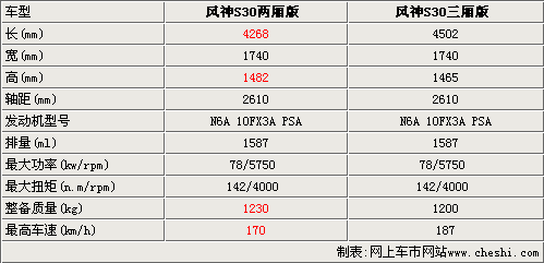 風(fēng)神S30兩廂版在尾部的車身結(jié)構(gòu)上有明顯變化,所以整車的參數(shù)也會隨之改變。通過與三廂車型的參數(shù)對比發(fā)現(xiàn),風(fēng)神S30兩廂版的車身尺寸有了明顯變化,其中長度縮短了234毫米,高度則增加了17毫米。雖然外形尺寸有明顯變化,但風(fēng)神S30兩廂版的軸距并無改變,保障了后排的空間優(yōu)勢。風(fēng)神S30兩廂版依然采用PSA 1.6L發(fā)動機(jī),但整備質(zhì)量增加了30公斤,多少會影響整車的動力性能,最高車速只能達(dá)到170公里每小時。