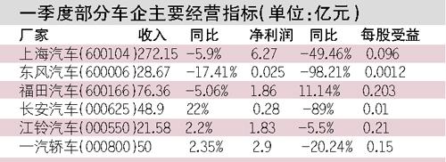 中國汽車工業(yè)協(xié)會的統(tǒng)計(jì)數(shù)據(jù)顯示,今年一季度汽車產(chǎn)銷256.76萬輛和267.88萬輛,同比增長1.91%和3.88%。盡管結(jié)束了去年四季度銷量下降趨勢,但從部分披露一季報(bào)的上市公司來看,由于一季度汽車銷量增長主要是受小排量車和微客的帶動,而這兩類車單車?yán)麧櫰停麧欂S厚的B級車出現(xiàn)了滯銷情況,導(dǎo)致大量車企出現(xiàn)“增產(chǎn)不增收”的怪現(xiàn)象,利潤同比下降近五成,東風(fēng)和長安的凈利潤下降了八九成,只有個別企業(yè)出現(xiàn)一定車程度的增長。