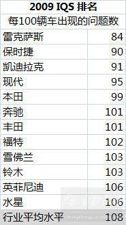 JD Power的2009年研究,訪(fǎng)談超過(guò)了80900名買(mǎi)家,關(guān)于他們頭三個(gè)月的使用情況,共提問(wèn)228個(gè)問(wèn)題,這項(xiàng)研究從2月進(jìn)行到5月。這項(xiàng)研究共包括了37個(gè)品牌,基于2009款車(chē)型,統(tǒng)計(jì)在頭90天內(nèi)被車(chē)主發(fā)現(xiàn)的質(zhì)量問(wèn)題。